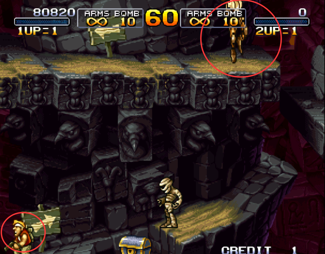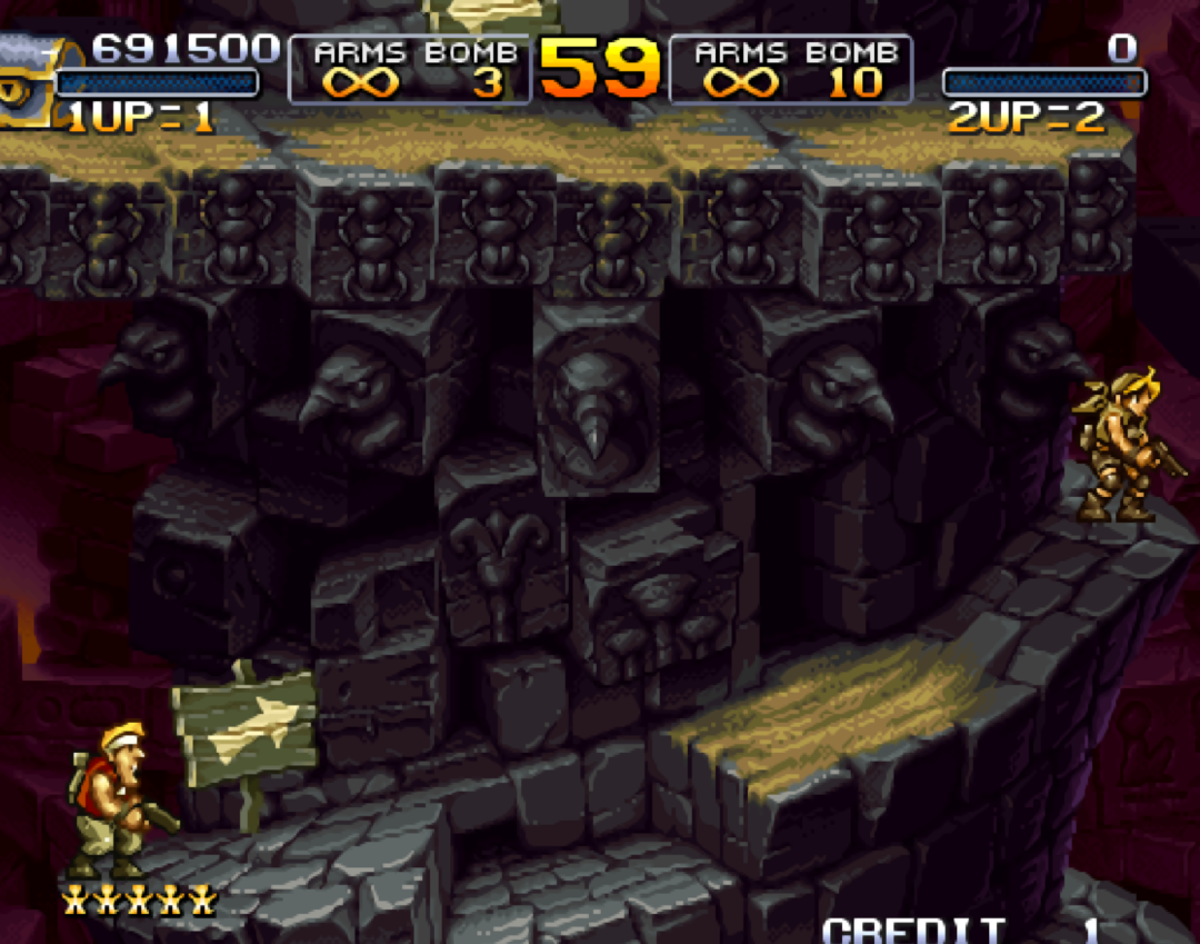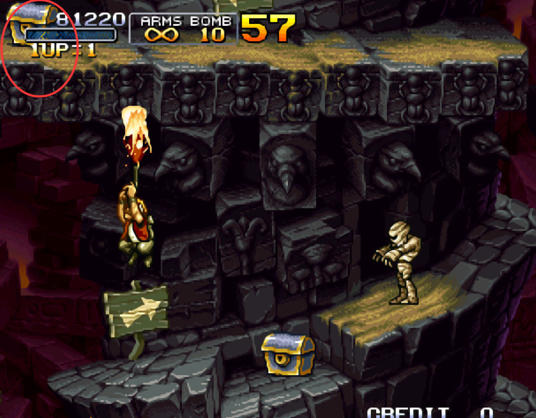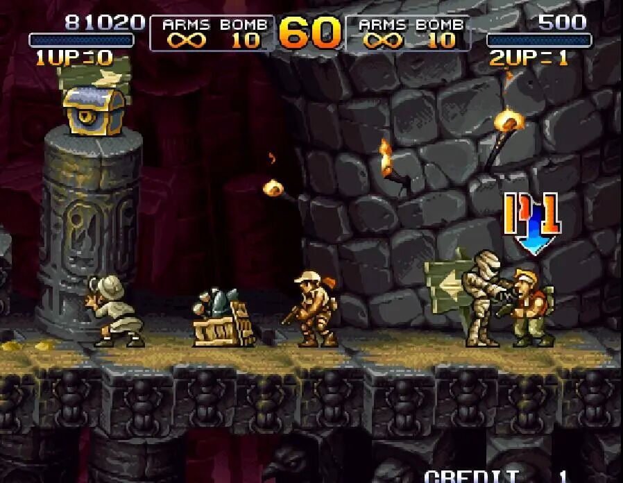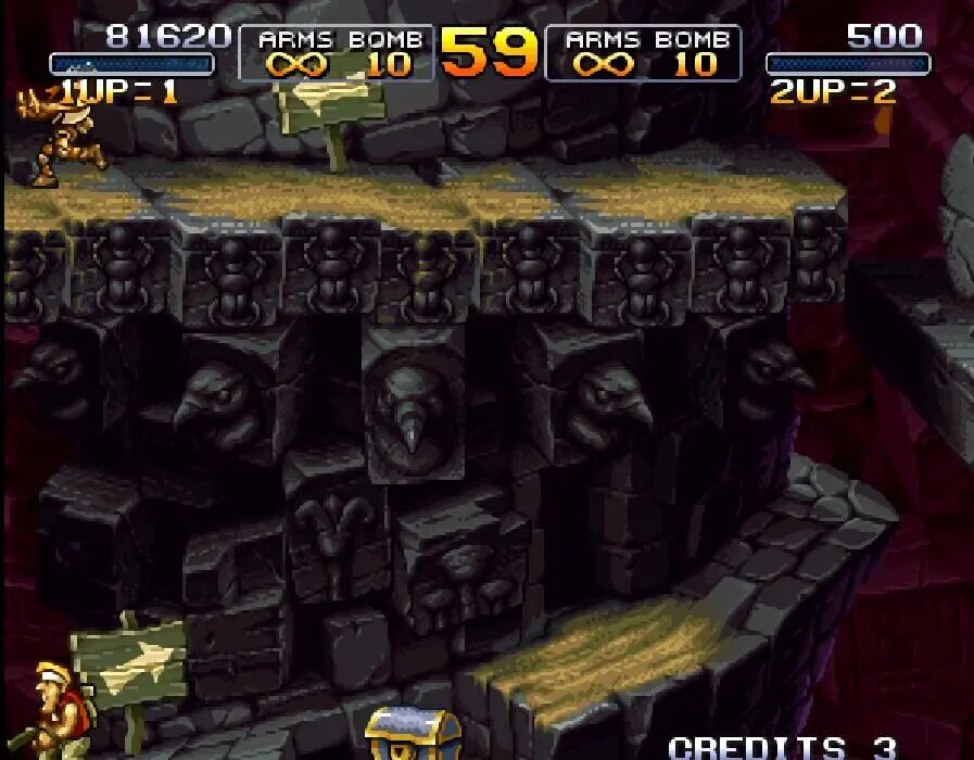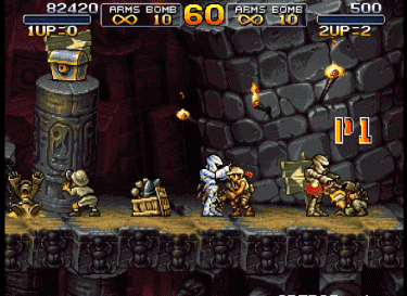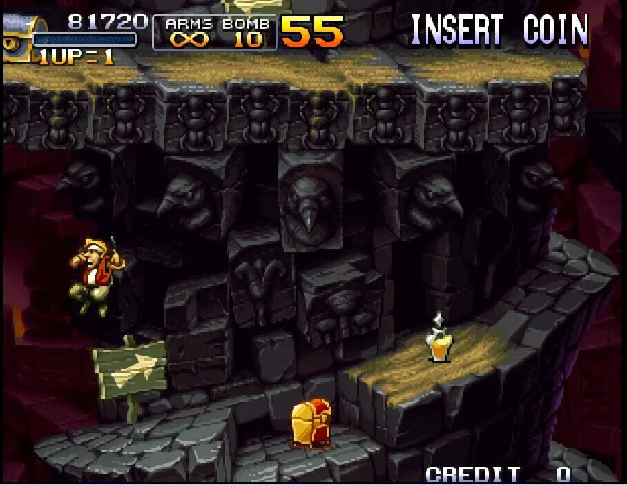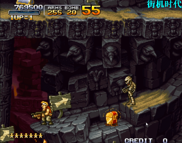 《合金弹头2》中隐藏道具最多的关卡绝对是2关,我们看到的图腾和石像上面很有可能存在宝石,甚至在刚刚进入场景的时候,还有旷工专门为我们挖宝。