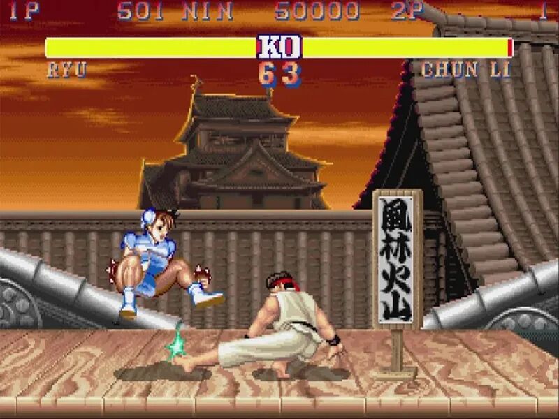 另一边,在《街头霸王2》隆的场景中出现了“风林火山”的招牌,要是人物挨打的话,是有可能将这个招牌打碎的。
