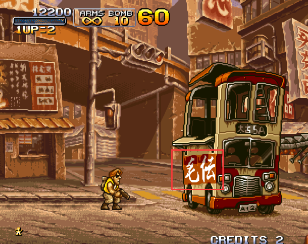 在日语里“毛传”的读音和英语的“MORDEN”非常相似。“MORDEN”就是《合金弹头》系列中最大的反派和幕后黑手莫登。也就是说,这个双层大巴其实是叛军的。