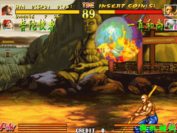 除了《双截龙》的卜洛夫,《傲剑狂刀》中的普陀使者也能通过法力将自己做成一个能量弹,释放出去一旦击中对手,还能接上连段。要是此时红气槽和蓝气槽都满了的话,那就可以将整个连段套路完全释放出来,对手不死也要掉一层皮。