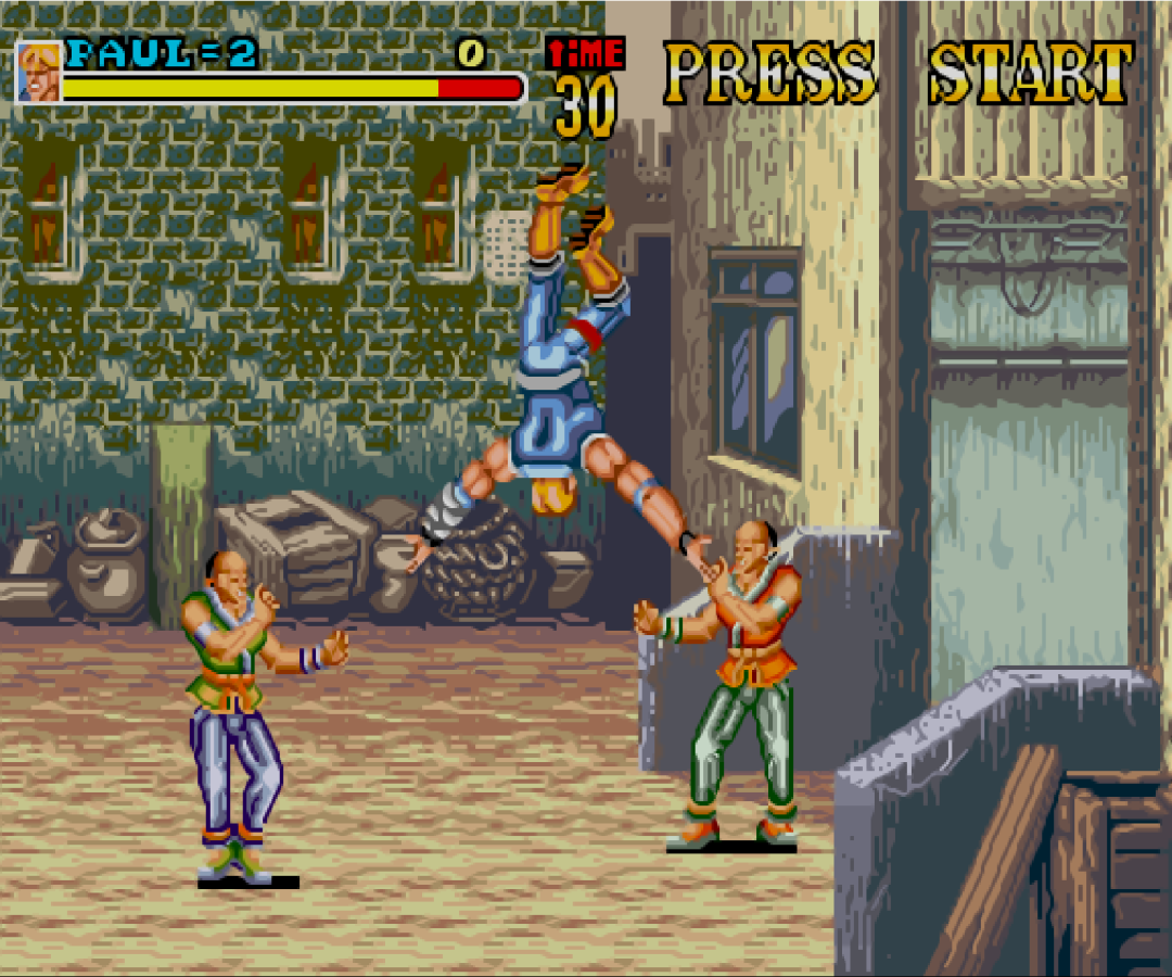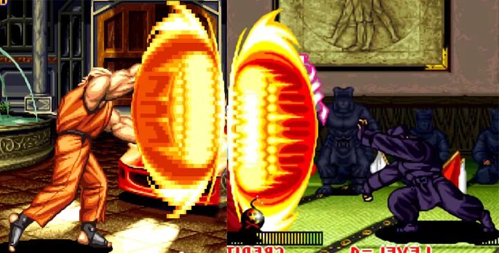 应该就是来自红白机游戏的《功夫》吧!这款八十年代的游戏中就曾经出现了好几位使用飞行道具的人物。特别是第三关的淘,打出来的火球已经和如今的“波动”非常相似了。