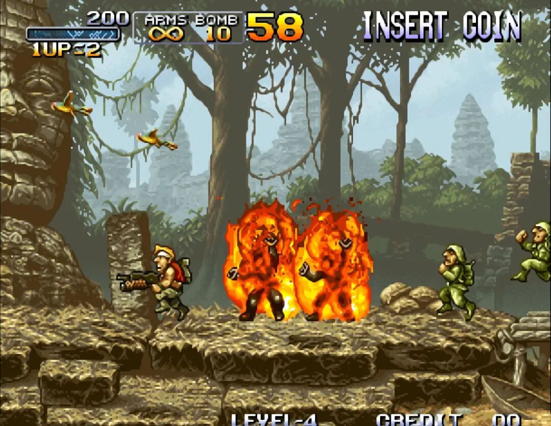 《合金弹头1》游戏中的时间可以无限延迟,玩一个小时非常轻松。