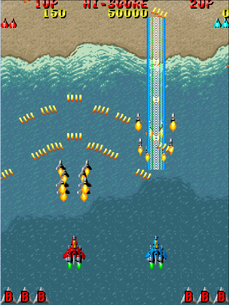 在没有火力的时候,只能东躲西藏,甚至连很多精英怪都打不死。但只要吃满了火力就可以放开手脚大干,游戏难度瞬间降低。《鲛鲛鲛》和《雷电》都有大范围攻击,导致很多杂兵刚刚出来,还没有来得及发射就被打死了。