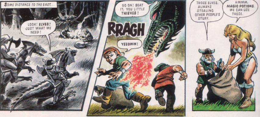漫画中还出现了一个很有意思的画面。主角一行人远远看到了正在休息的小偷,然后让坐骑喷火将他们全部吓走了,打开他们的口袋之后发现了大量的魔法药水。这也算是礼尚往来吧!