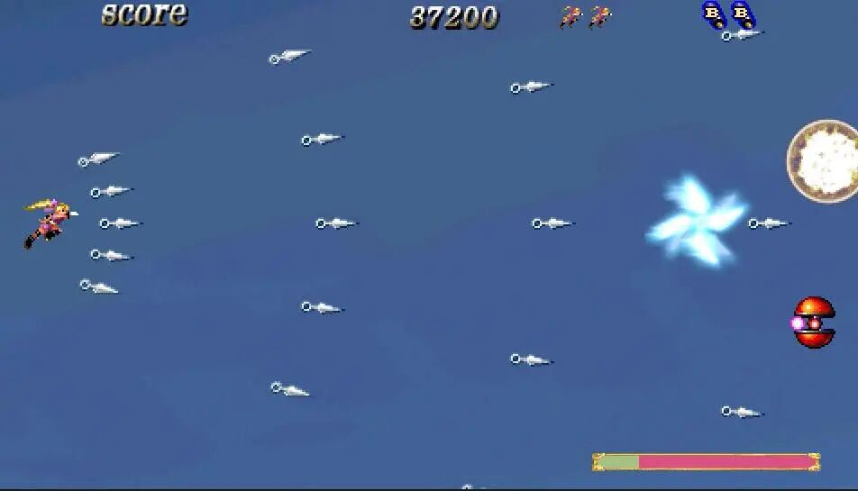 阿伊的炸弹一直都是彩京系列中的最强攻击手段,就算是BOSS也扛不住两下。前期只要多积攒一些炸弹,打BOSS的时候一点压力都没有,能砍就砍,砍不死就放炸弹。
