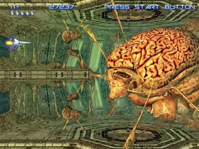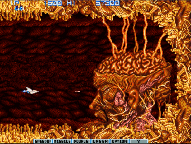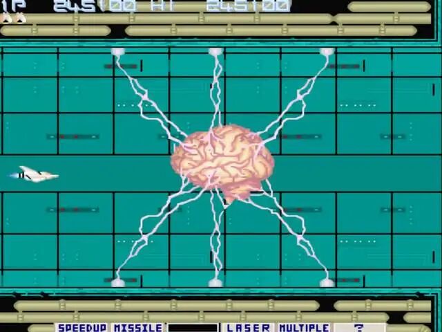1985年科乐美发行了《宇宙巡航机1》,在这个版本中首次出现了一只大脑BOSS:Xaerous Brain。是入侵母舰内部的奇异生物。