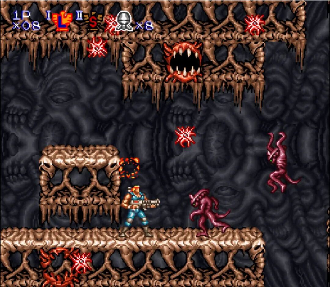 像是《魂斗罗2》第七关,我们可以清晰地看到天王鬼的“排骨”和“身体组织”,只不过那时候并没有想太多,以为这就是一个异形孵化的地方。