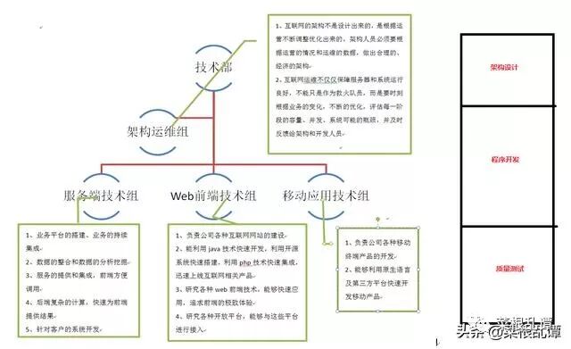 目前团队成员还比较少,如果每个人都均衡发展,对于技术体系就不会深入;但是如果都划定清晰的方向,只走专业化路线,意味着每个方向只有一两个人,项目开展就很难调动人力,这也是不可能的。所以每个方向固定第一梯队的人员,在该方向上能够专业化发展,同时每个方向的第一梯队的人员又将是其他方向的第二梯队,保证人力资源能够均衡的被调配,满足各种项目的开展。同样在岗位上,我们依然是按照这个思路来进行,每个人都应具备"架构设计"、"程序开发"、"质量测试"的部分能力,打破角色之间的界限。这对每个人的整体素质要求是非常高的。