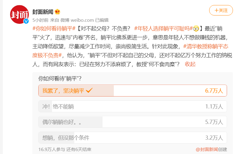可惜网友们对教授的苦口婆心并不买账,反而纷纷出言讽刺教授是既得利益者的“ 何不食肉糜 ”。封面新闻开展的一项“ 你如何看待躺平 ”的投票中,有 6.7万 人选择了“我累了,坚决躺平。”只有 1.1万 人斗志昂然,选择了“冲!绝不能躺。”