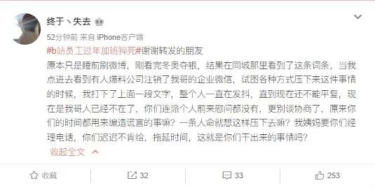 但疑似B站猝死员工家属后在微博发声,表示该员工已于昨日(2月6日)安葬。死者母亲打电话,发短信都通知了公司对接人员,对方只是说,发生这种事情我们也很抱歉,但是却没有安排人来慰问一句,一个人都没有。