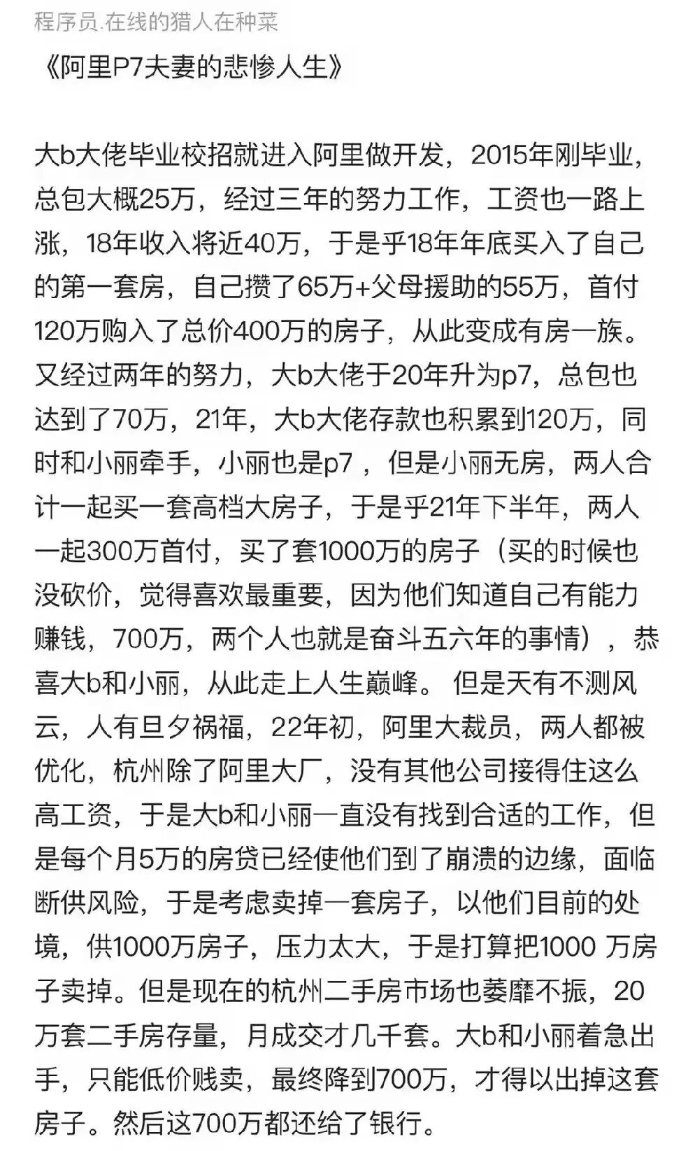 另外,在大厂拿惯高薪的人,裁员后找工作必然会感到和之前的巨大落差而产生的失落感。大丈夫能上能下,既要有无限风光在险峰的豪情,也要能接受半山腰的风景。如果像上图这样的故事,未免过于矫情,有拉仇恨的嫌疑。如果这都算悲惨人生,估计全国95%的人都生活在水深火热之中了。