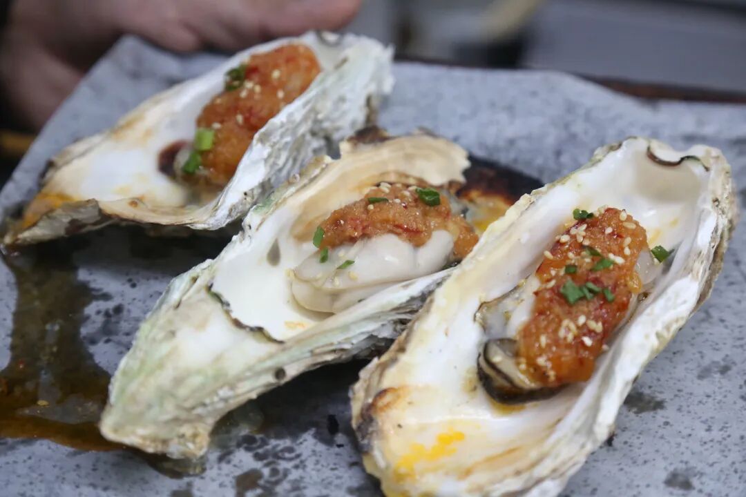 这些生蚝最大一斤一个,肥美鲜甜,稍一炙烤,便汁水四溢,再淋上一层蒜蓉,鲜美的汤汁连舌头都要化掉。