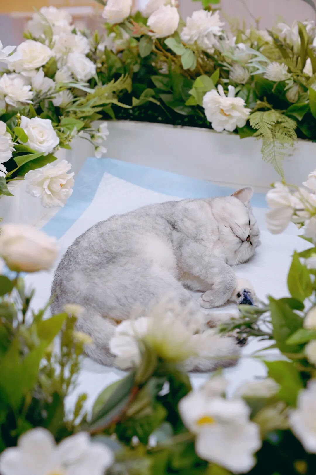 特殊的是,灵台上躺着的是一只英短渐层猫咪。宠物安葬师为它清洁毛发,按下爪印,进行告别仪式,随后关上门,让主人与爱宠进行最后的告别。最终,这只猫咪会被火化,骨灰装进罐子,以另外一种方式回到主人身边。