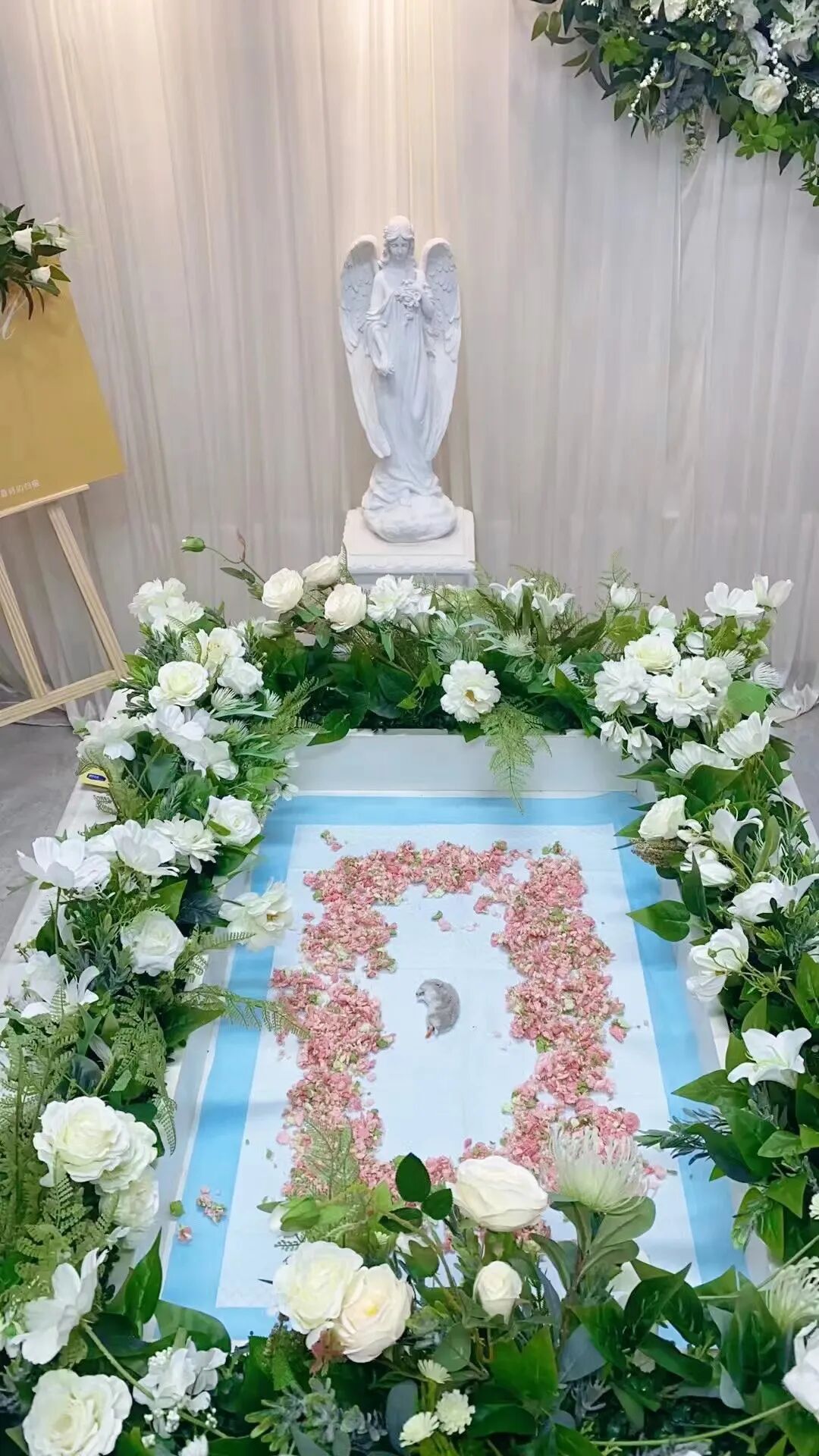 天使、花床、哀乐,在武汉的一间房子里,一场小型追悼会正在举行。