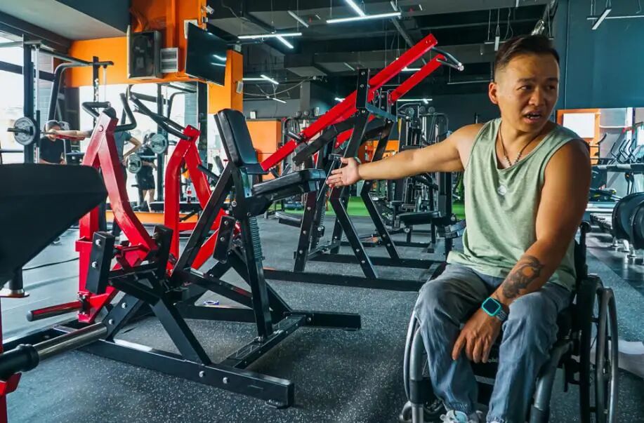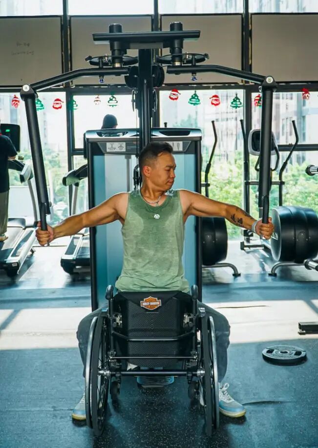 他叫陈涛,今年32岁。8年前,一场意外伤了脊椎导致双腿瘫痪。爱上锻炼的他,坐着轮椅自学健身动作,乐观坚持10个月后,原本180斤的他瘦了50多斤。