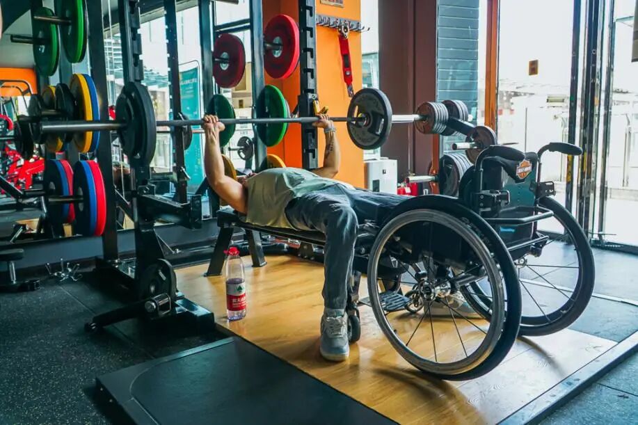 武汉的一家健身馆内,一位小伙儿正在挥汗如雨,唯一不同的是,每完成一组健身动作后,他努力用双手支撑自己的身体坐回自己的轮椅。