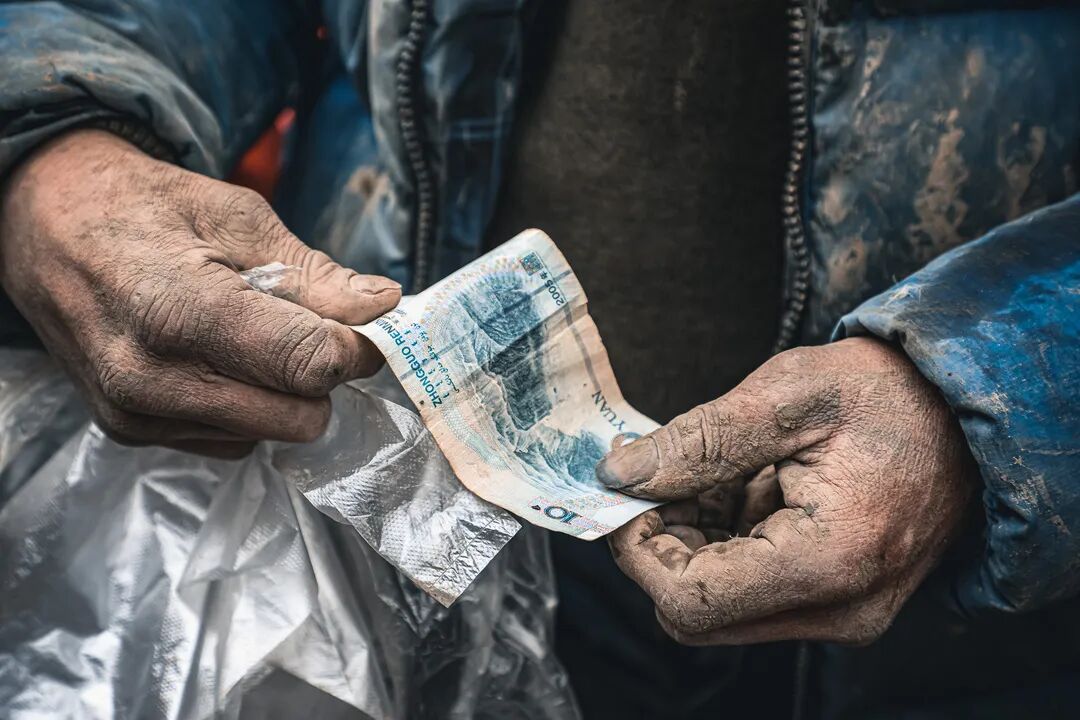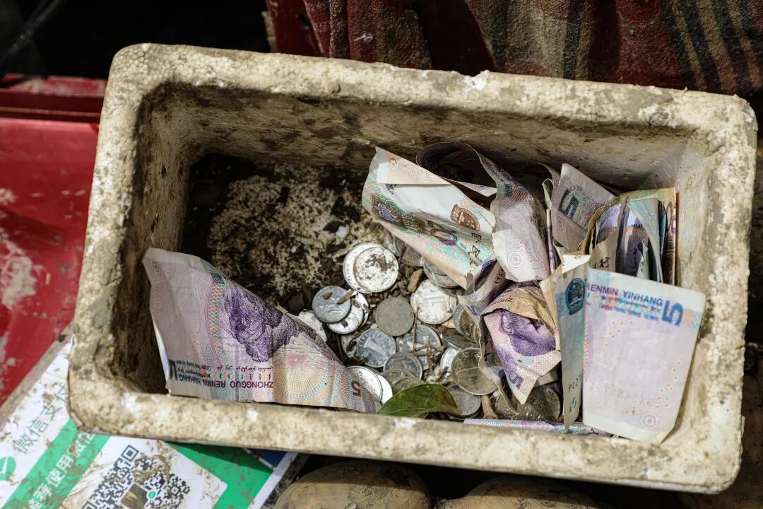 ▲好不容易成交一单,老周沾满泥巴的手正在给顾客找零钱