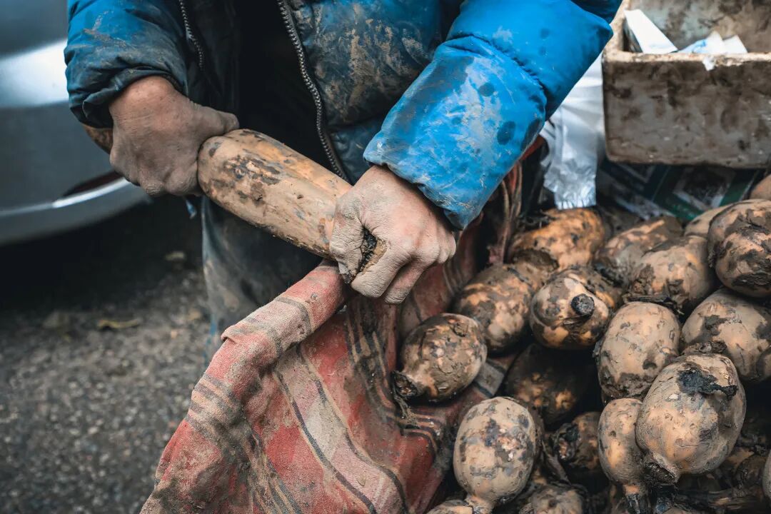“2块,2块,粉藕,不粉包退”,见到有人从小摊前走过,满身是泥的老周斜倚着身子,用吆喝声吸引着过往路人,言语有些许模糊不清。