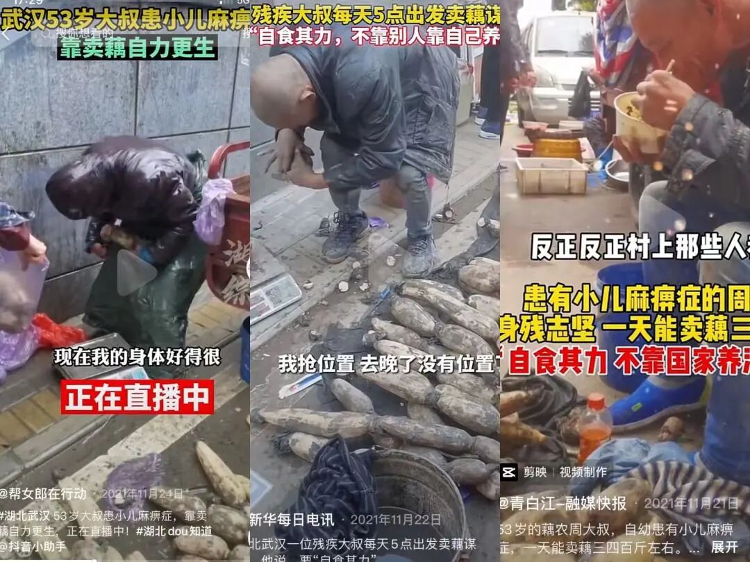 老周也算是个话题人物,身残志坚卖藕谋生的故事,让省内外媒体都争相报道,一句“自食其力,不靠别人,靠自己养活”的正能量话语,让老周吸纳了不少粉丝。