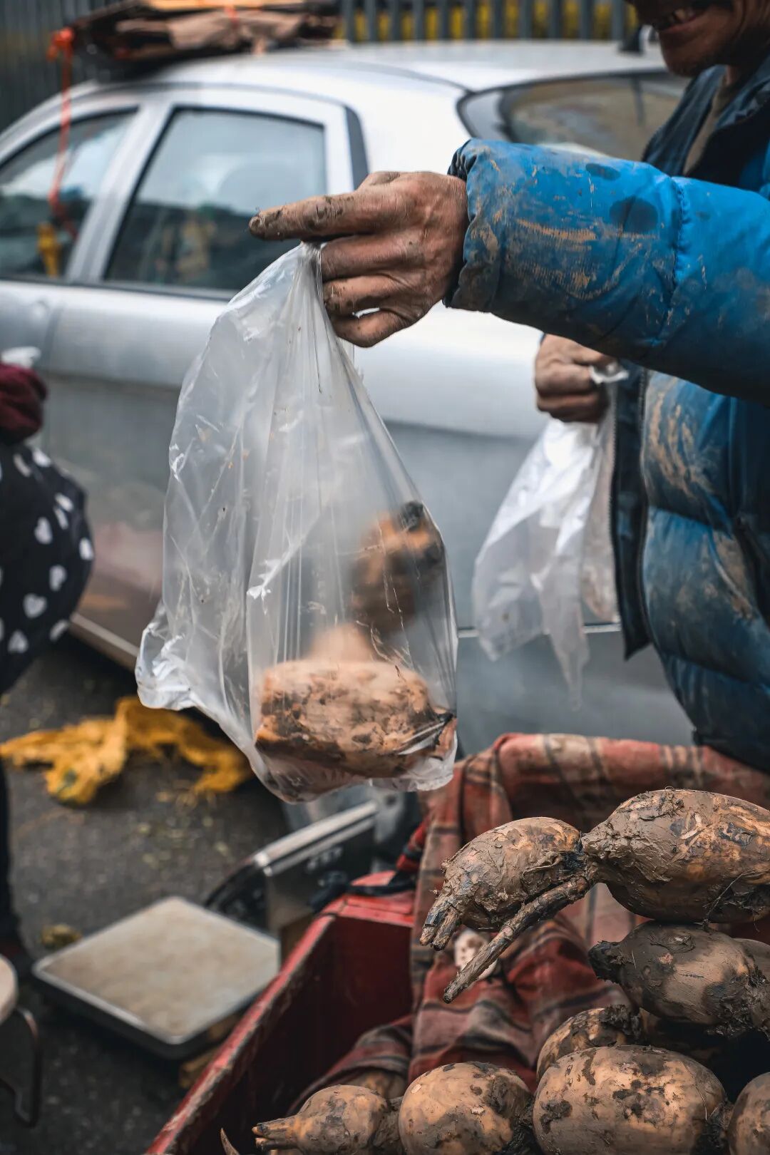 其实老周被偷的不光是手机,大冬天守摊卖了一天的藕钱,放在泡沫箱里,连盒子都被抱走了。