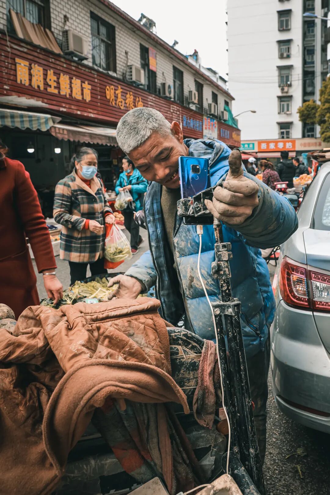 这位摆摊还开着直播的大叔,在熙熙攘攘的菜市场里显得格外时髦,大爷大妈自顾低头挑菜,并没察觉正被手机镜头窥视着。