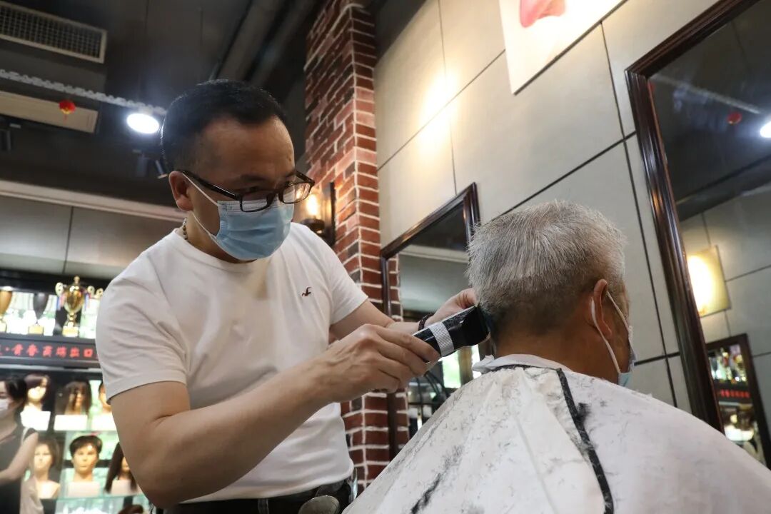 伴随清脆的咔嚓声,花白的头发随剪刀落下。苏昶铭先剪出造型,再换把剃头修理鬓角,眼神专注,手法熟练,一气呵成。一套流程结束后,他解开围布,细心的用毛巾擦掉爹爹脖子上的碎发,再帮忙整理好衣领。