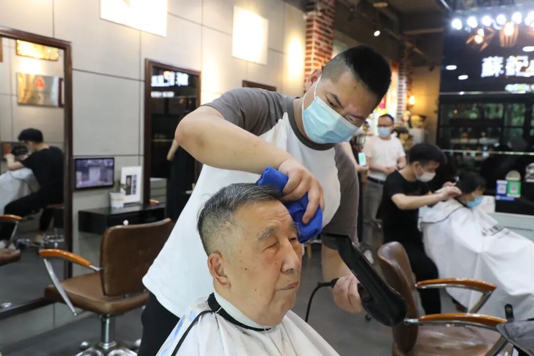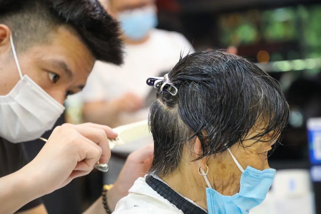 虽然是免费服务,但洗、剪、吹的步骤一样没少。从开业就在这理发的汤婆婆,正闭眼享受洗头按摩,“我在老家哪里享受过这种待遇哟,随便一剪子下去都是要收钱的!”她说。