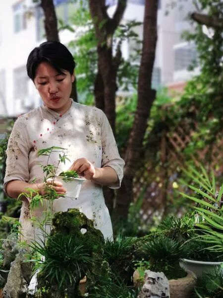 以前书画展,都是平面的,字画挂在墙上供人欣赏,朱长虹想到,可以把菖蒲的自然美和书画的艺术美结合起来,为此,她还拜师学了盆景制作。