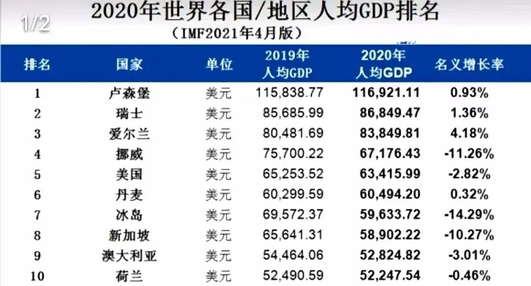 人均GDP达到8万美元究竟是什么概念?根据国际货币基金组织发布的世界人均GDP排名,2020年全世界只有3个国家的人均GDP超过8万美元,分别是:卢森堡、瑞士、爱尔兰,所以按照人均GDP数据来看,新加坡可以排名世界前五。