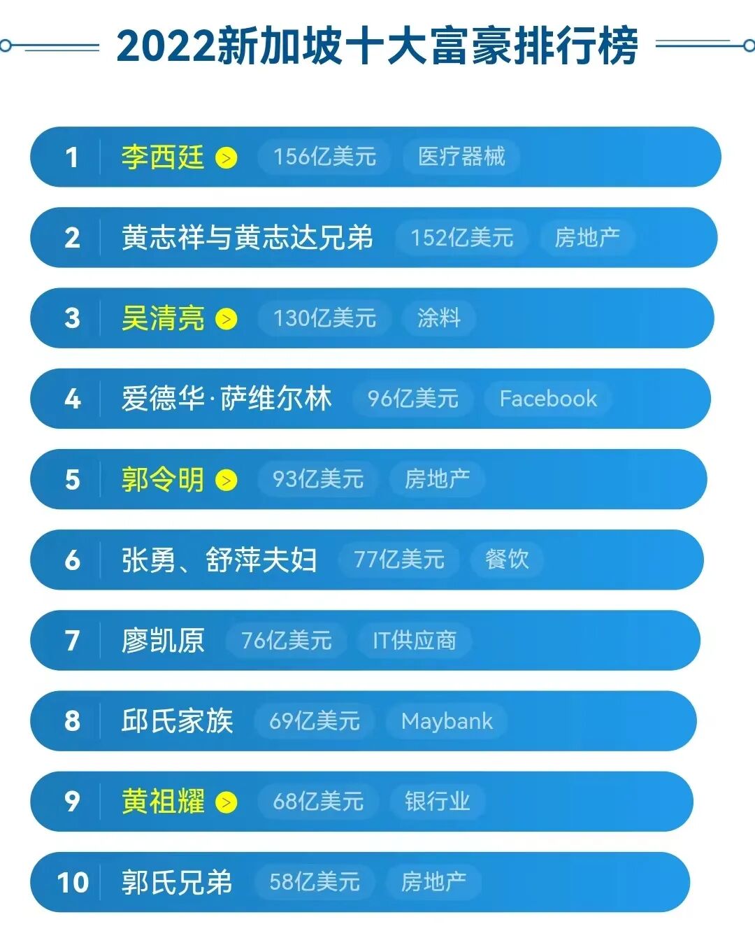 2022年的新加坡首富依然是华人——李西廷,迈瑞医疗的创始人,在2022新加坡富豪榜前十名当中,有9位都是华人。