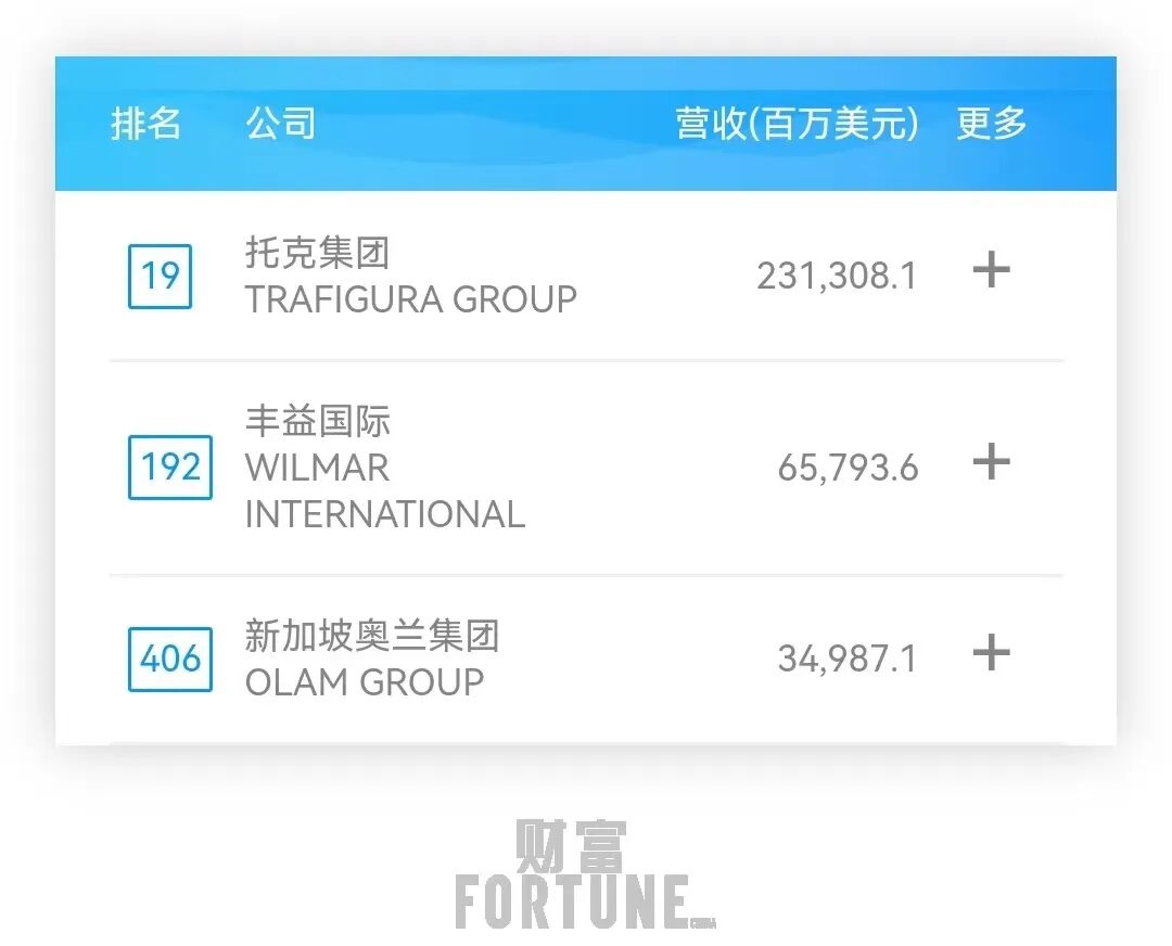 在2022年《财富》世界500强榜单中,新加坡有3家企业上榜,分别是:托克集团、丰益国际、新加坡奥兰集团。其中,托克集团的营收达到2313亿美元,排名全球第19位,丰益国际是全球最大的粮油食品集团之一,有超过50%的营收来自中国市场,金龙鱼就是丰益国际集团旗下的品牌。