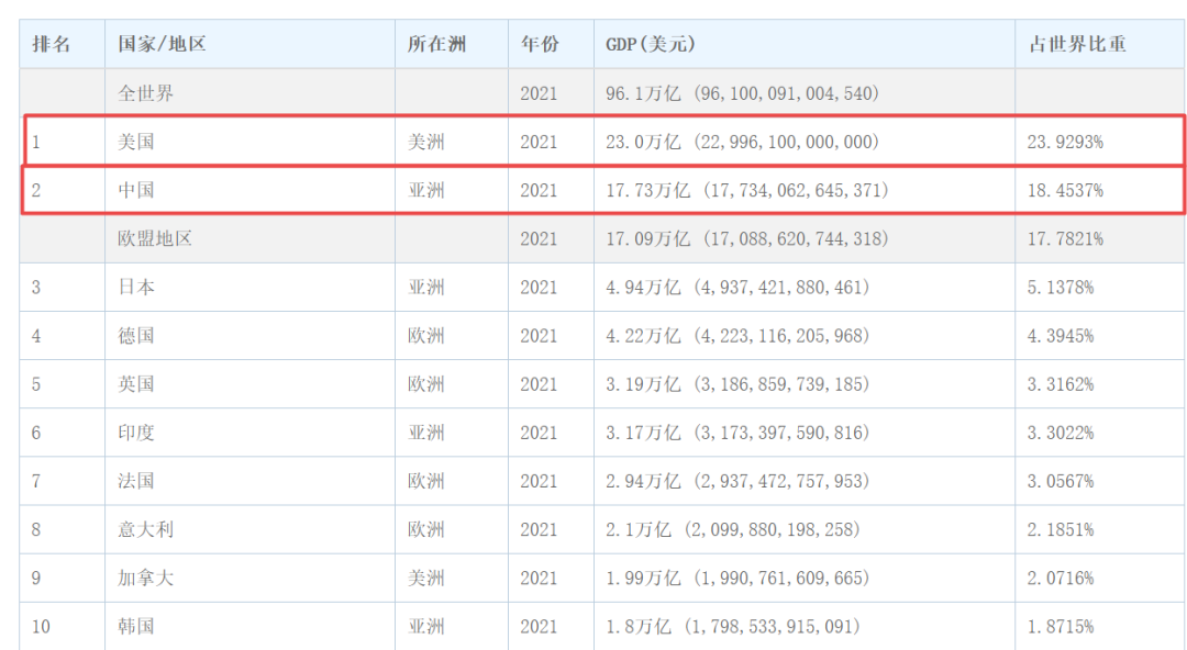 2022年中国和美国的GDP位置没有变化,今年前三季度中美两国GDP分别达到:13.17万亿美元、18.78万亿美元,美国经济增长2.4%,而中国经济增长3%,在第三季度GDP增长反弹助力下,前三季度中国经济增速已经超过美国。