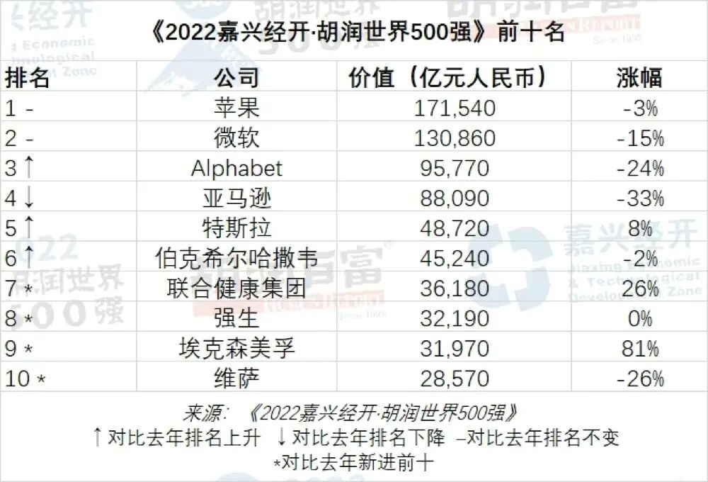 其中,苹果公司以17.15万亿的市值位居榜单第一,微软以13万亿市值排名第二,市值超过10万亿人民币的企业仅有2家,都是来自美国的科技巨头,谷歌、亚马逊市值超过8万亿,榜单前列的公司大多来自美国。
