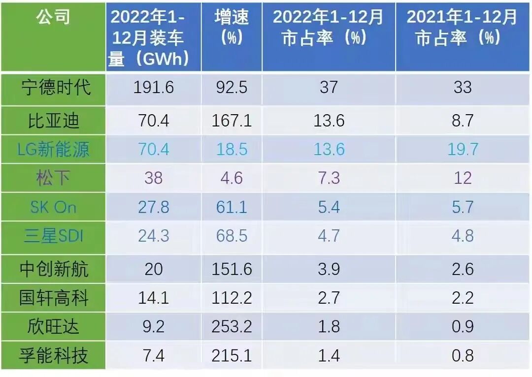 在新能源动力电池市场,中日韩企业几乎“垄断”了全球市场,中国企业的市占率达到60%,其中宁德时代和比亚迪就占了50%,韩国3家企业市占率为23.7%,日本松下市占率7.3%。