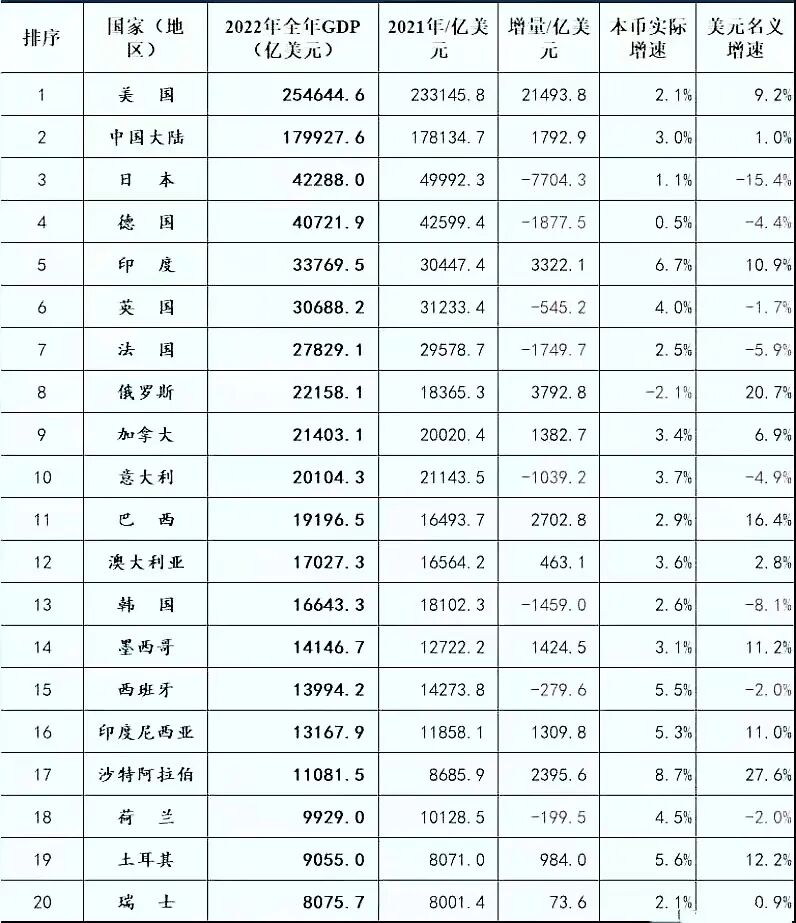 在多重因素影响下,2022年全球GDP前20强国家的排名“洗牌”,各大经济体之间的差距发生了很大的变化。