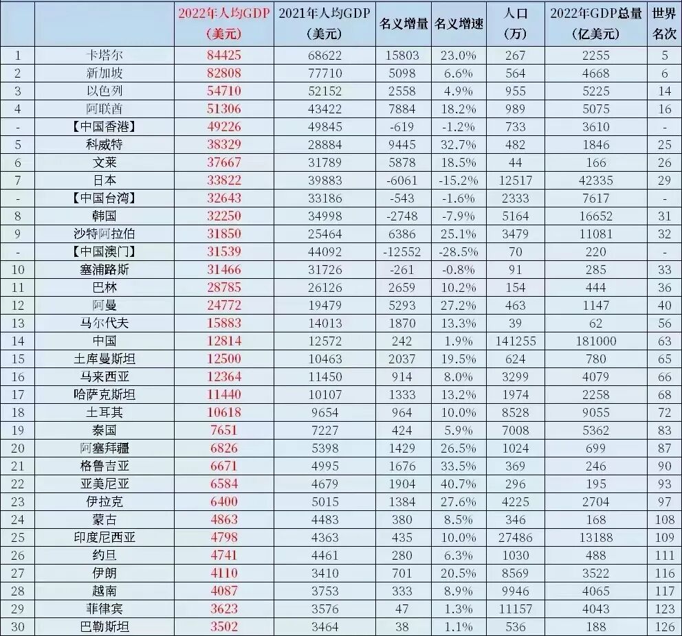 主要原因是去年国际油价飙升,作为产油国的卡塔尔经济规模大幅提升,人均GDP也随之大涨,同理,另一产油大国——沙特的人均GDP也成功突破3万美元,排名亚洲第九。