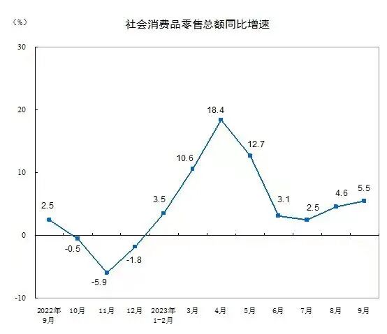 其中,4月份是消费增长的高峰,达到18.4%,3月、4月和5月这三个月的消费表现都不错,均实现10%以上的增长,但是5月开始持续下降,6月份直接跌回年初水平,随后缓慢回升,9月消费增长5.5%。