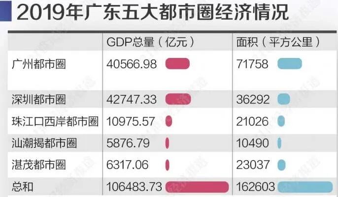 广州都市圈(广州、佛山、肇庆、清远、云浮、韶关)、深圳都市圈(深圳、东莞、惠州、河源、汕尾)、珠江口西岸都市圈(珠海、中山、江门、阳江)、汕潮揭都市圈(汕头、潮州、揭阳)、湛茂都市圈(湛江、茂名)。