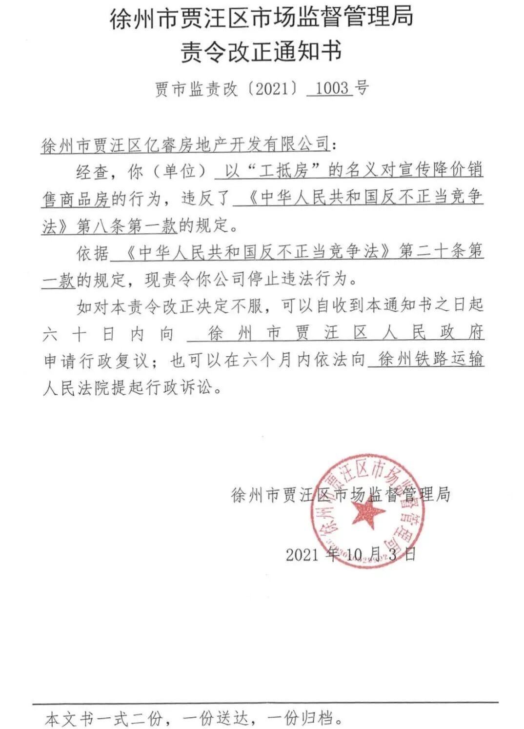 于是,立刻发布《责令改正通知书》,告知开发企业:其以“工抵房”的名义宣传销售商品房的行为,违反了《中华人民共和国反不正当竞争法》,责令停止该违法行为。情况说明提及,至10月11日,已退还41户意向金。