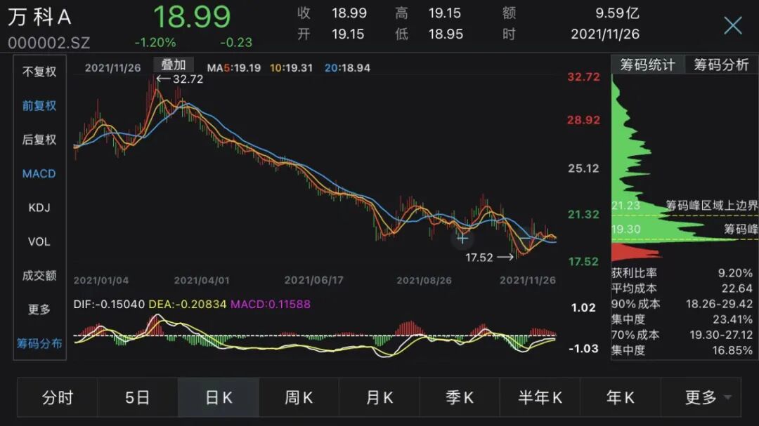 公开数据显示,截止到昨天,万科A报收于18.99元/股,相比于今年3月份32.25元/股的高点,下跌了41.12%。