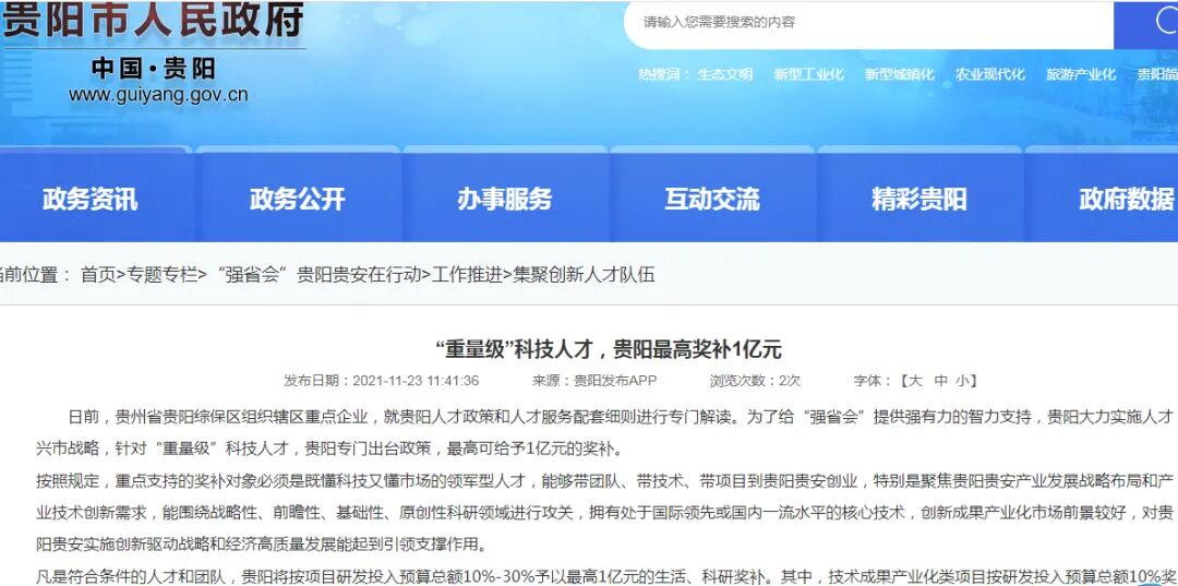 发展这些产业,需要大量的人才。不久前,贵阳发布了针对“重量级”科技人才的补贴政策,最高可给予1亿元的奖补。
