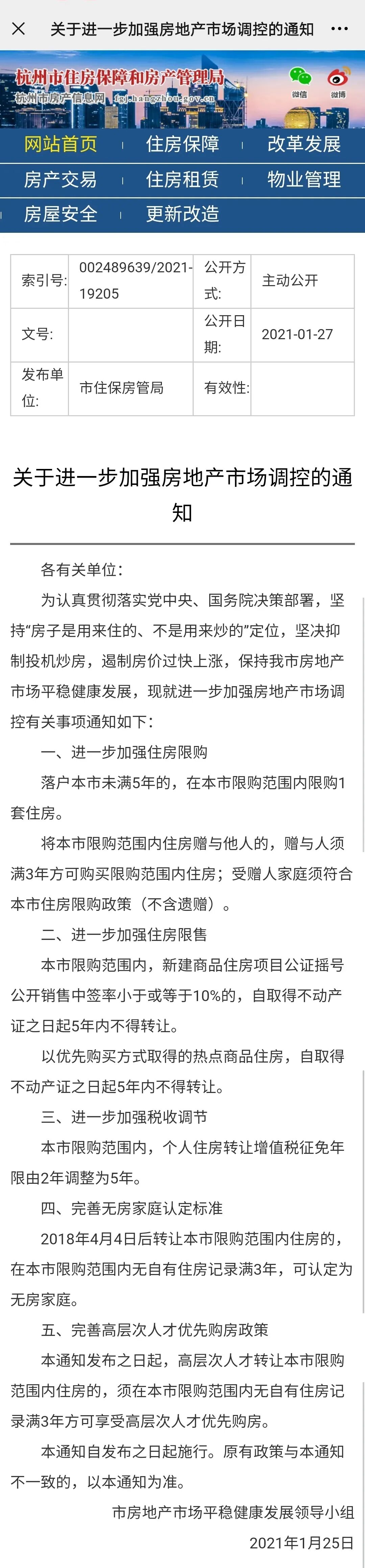 1月27日,杭州市住房保障和房产管理局在官网公布了“关于进一步加强房地产市场调控的通知”。共有5条: