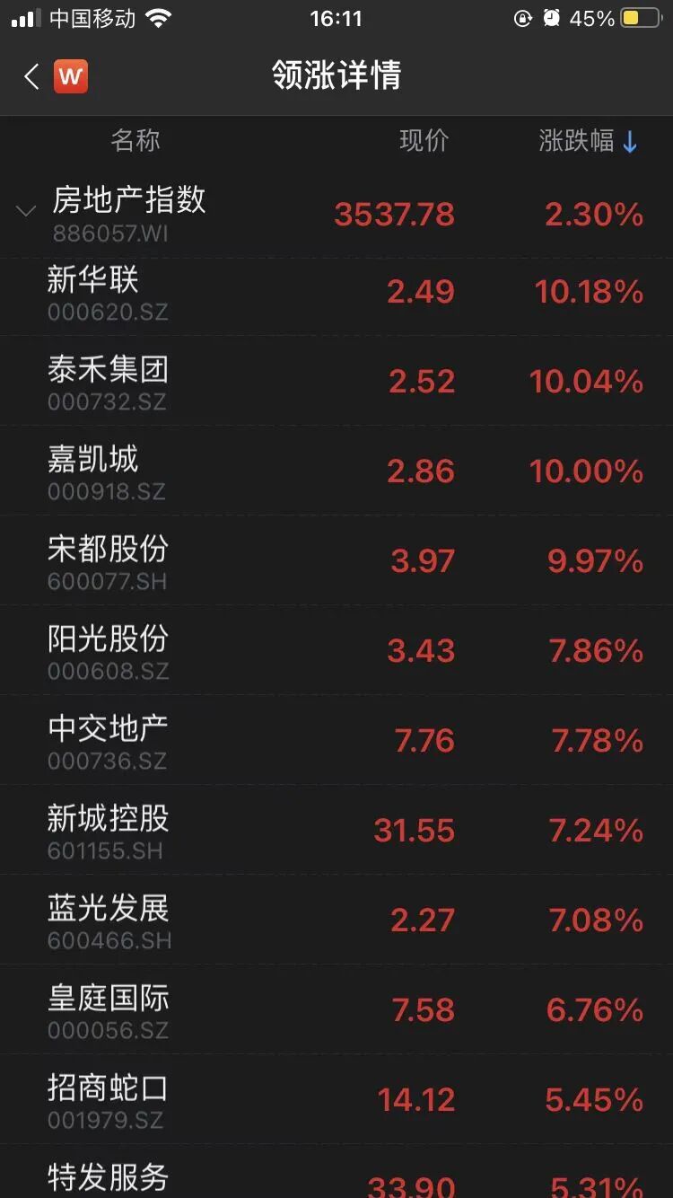 消息引发了今天资本市场上房地产板块大涨,整个板块上涨了2.3%,多只个股涨停。
