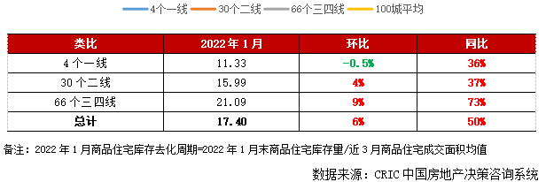 克而瑞披露的最新数据显示,截止到2022年1月份,被监测的100个城市库存量达到了6.2亿平方米。