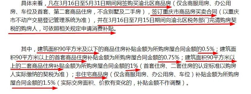 同时,重庆市渝北区还提出,活动期间的购房者(无论首套还是二套,无论是住宅还是非住宅,甚至车位,当然不含别墅与二手房),均可获得消费补贴。