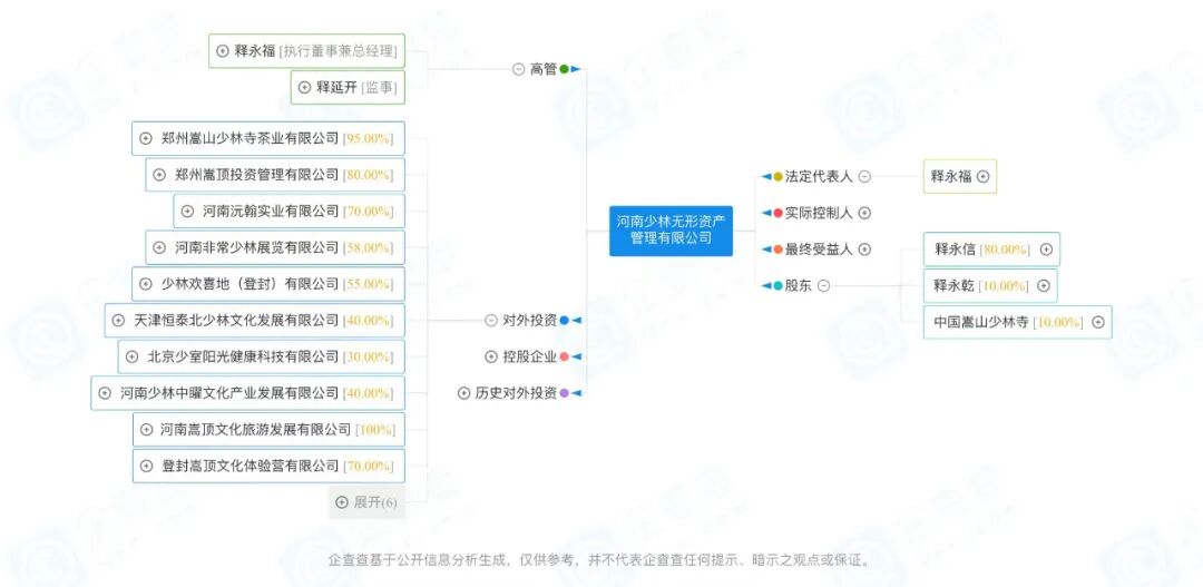 而沅翰实业最终受益人为目前河南嵩山少林寺方丈释永信。从股权路径看,释永信持有河南少林无形资产管理有限公司(下称“少林无形资管”)80%股权,后者持有沅翰实业70%股权。