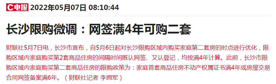 根据财联社消息,长沙对购买第二套房产条件进行了微调,限购区域内家庭购买第2套商品住房的间隔时间既认网签、又认登记,均按满4年计算。