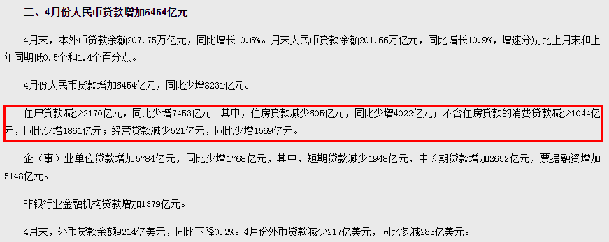 4月份人民币贷款增加6454亿元,同比少增8231亿元。