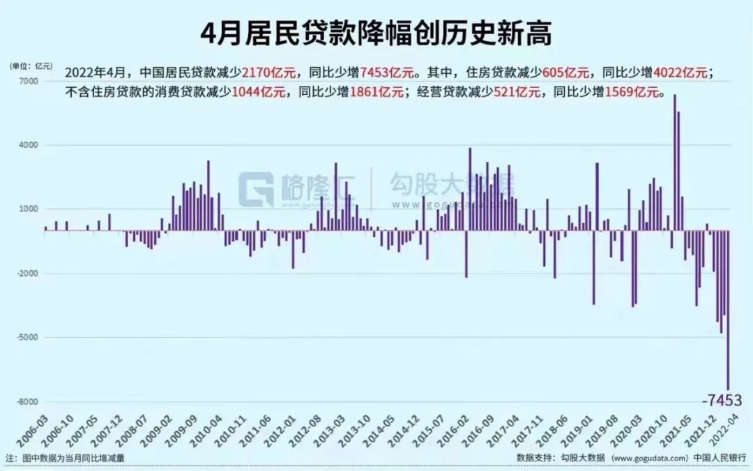 然而,在这样的背景下,4月份居民贷款降幅却创历史新高,其中住房贷款减少了605亿元,同比少增了4022亿元。