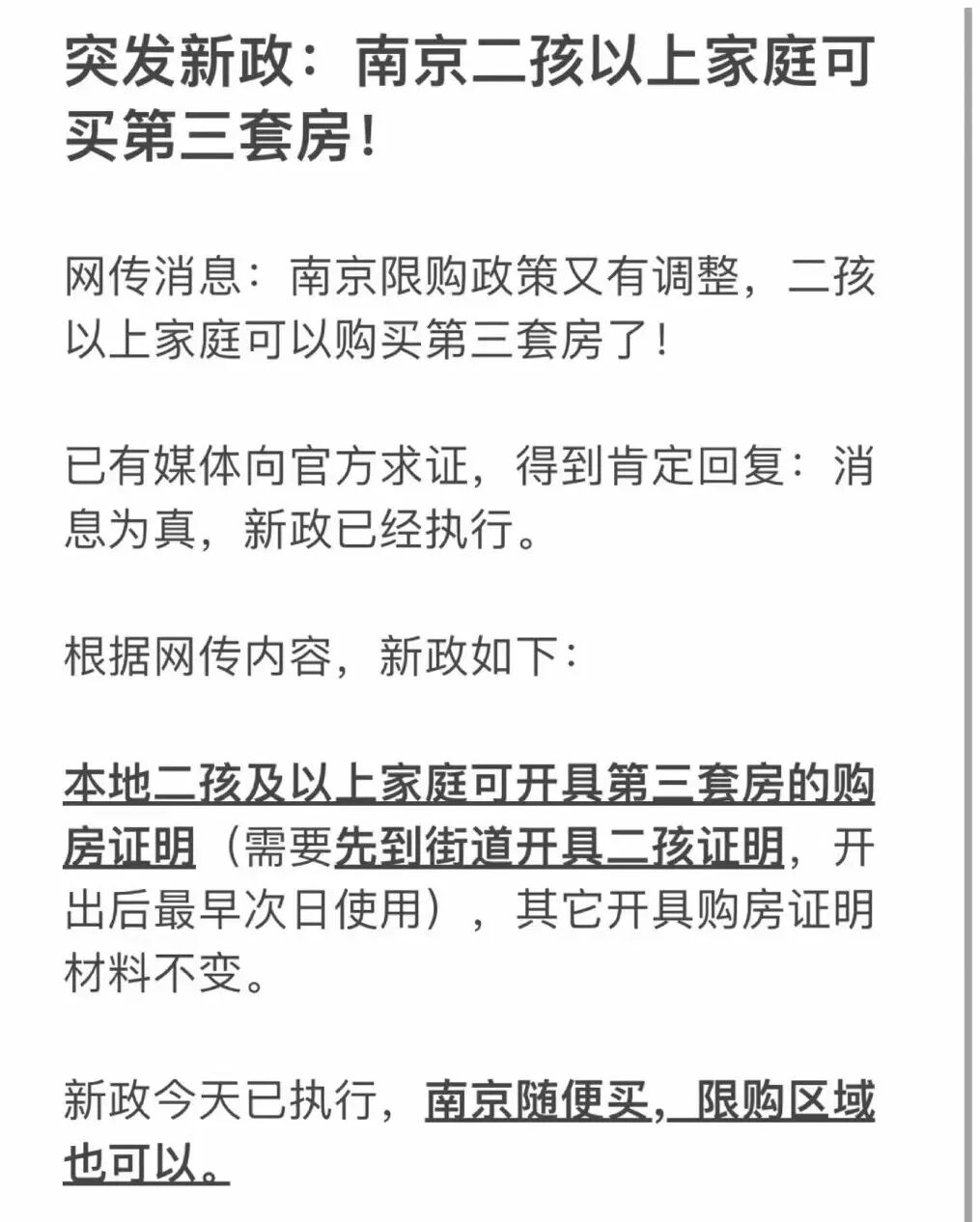 5月13日,财联社消息,有市场传言称,南京进一步放开限购政策,二孩以上家庭可购第三套房。